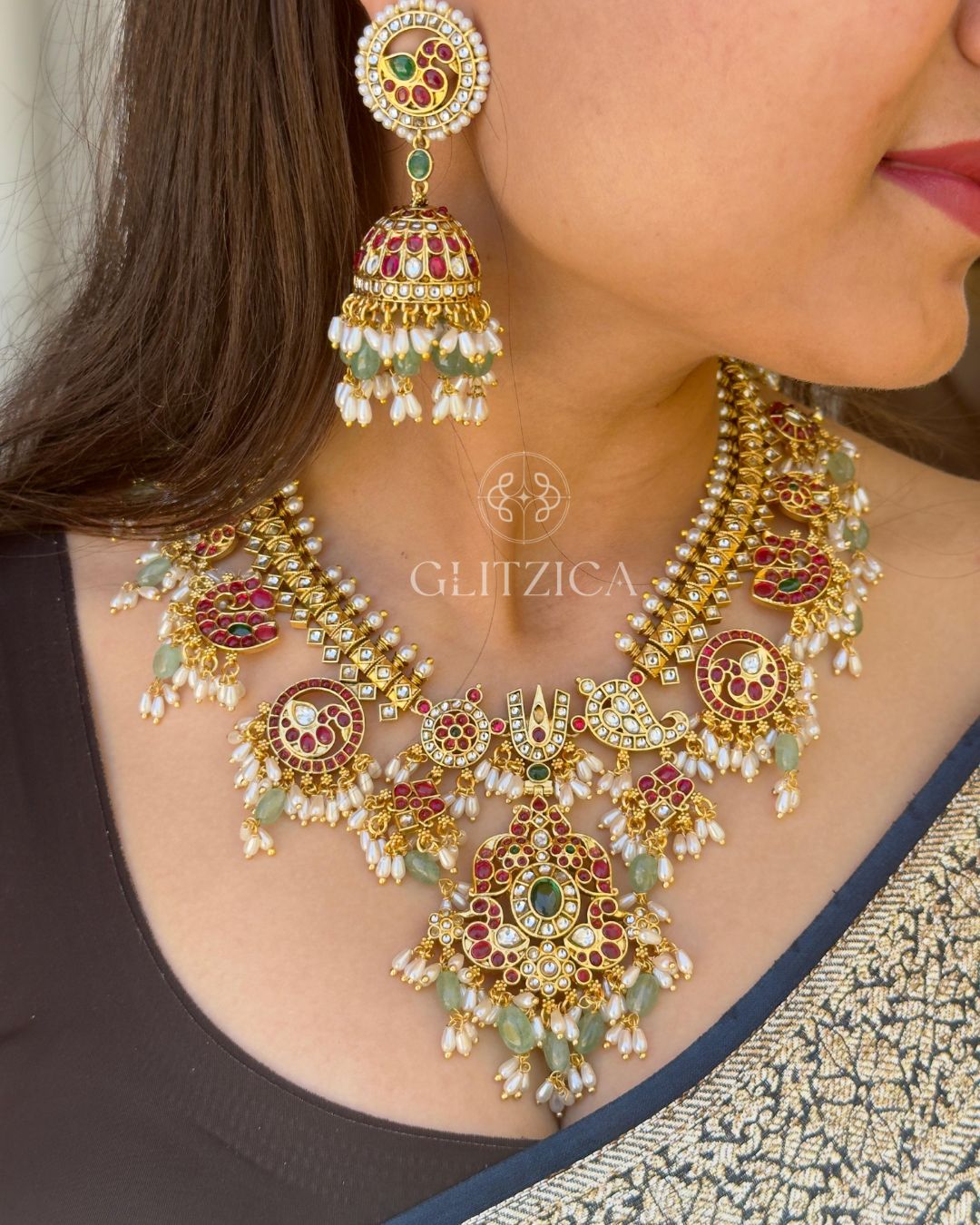 This Indri Kemp Polki Pearl Necklace Set celebrates the timeless beauty of traditional Indian artistry. Designed with deep red kemp stones, soft green beads, and lustrous pearls, it beautifully captures the essence of royal heritage.