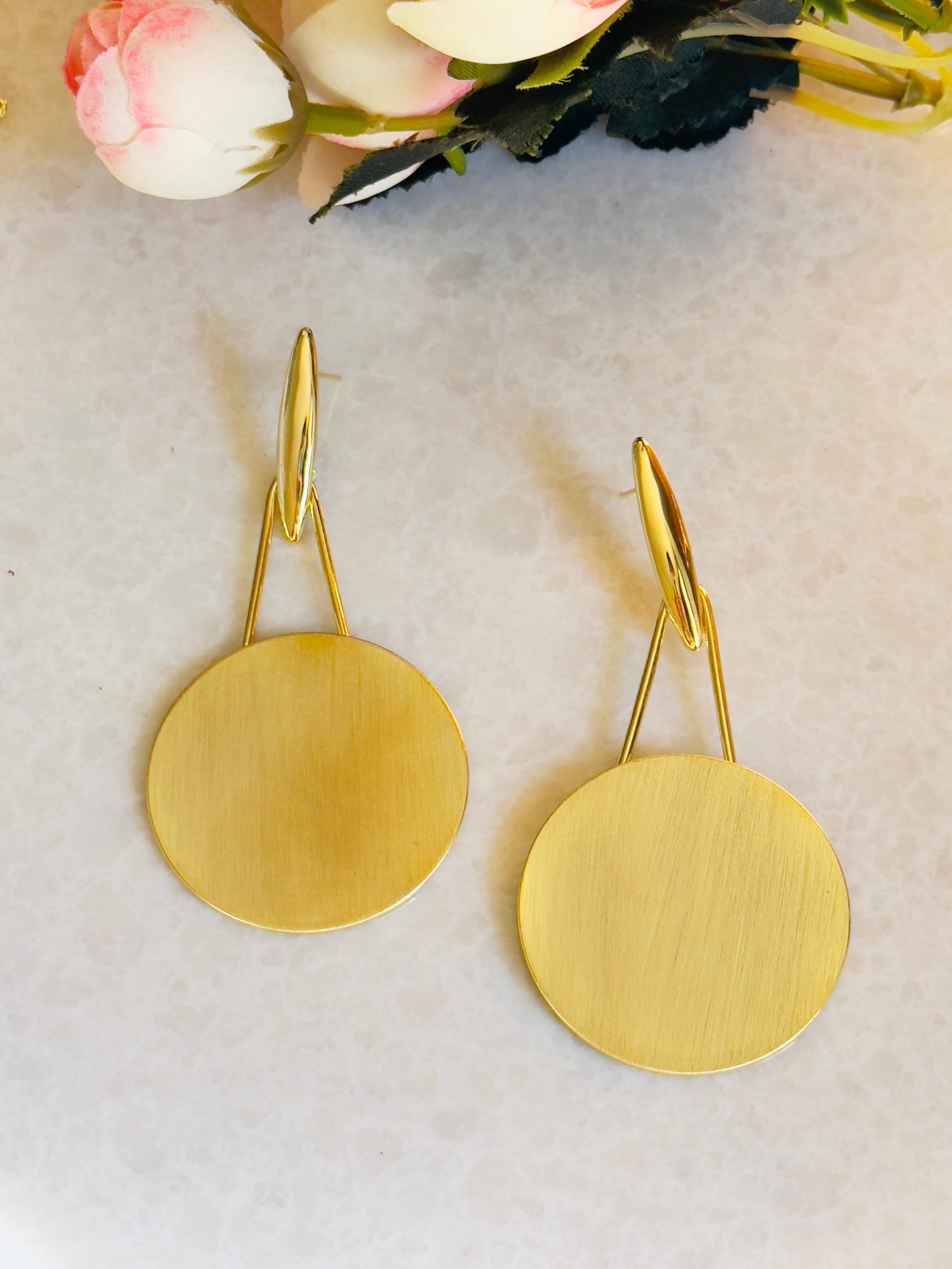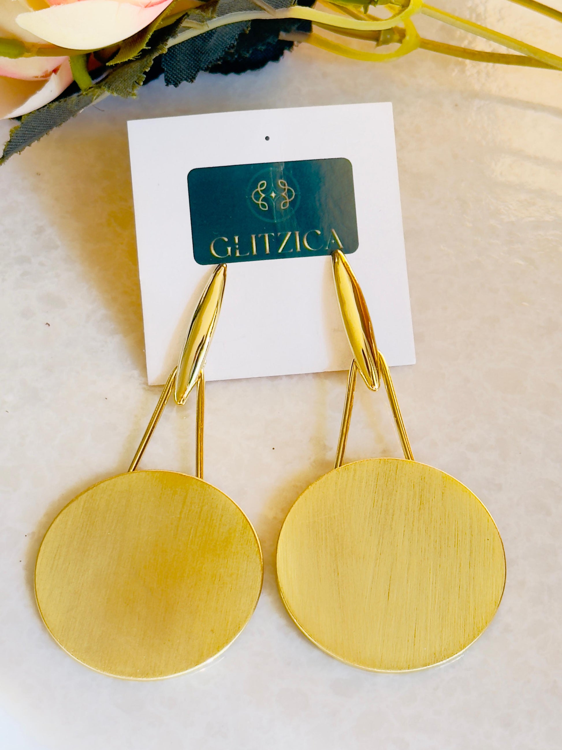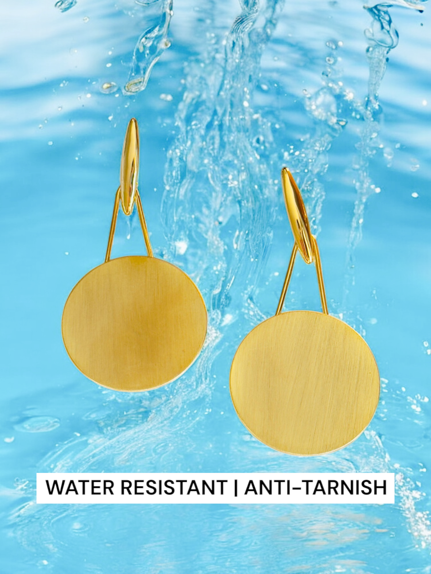 The Sienna Disc Drop Earrings are designed with a sleek oval stud connected to a bold, round matte-finish disc. These statement earrings are perfect for both casual and formal outfits. Made from stainless steel and plated with 18K gold, they have an anti-tarnish coating to ensure durability and shine