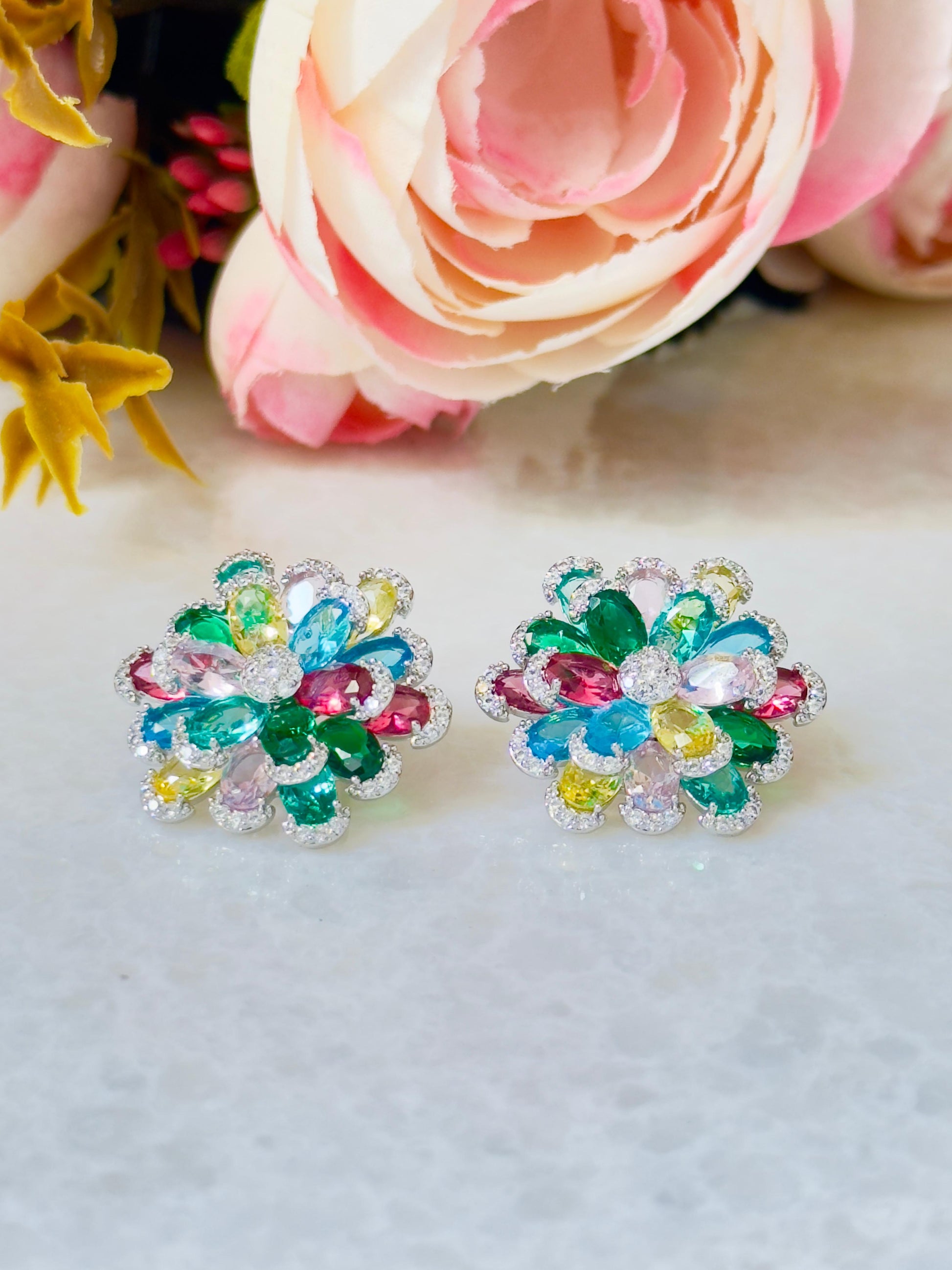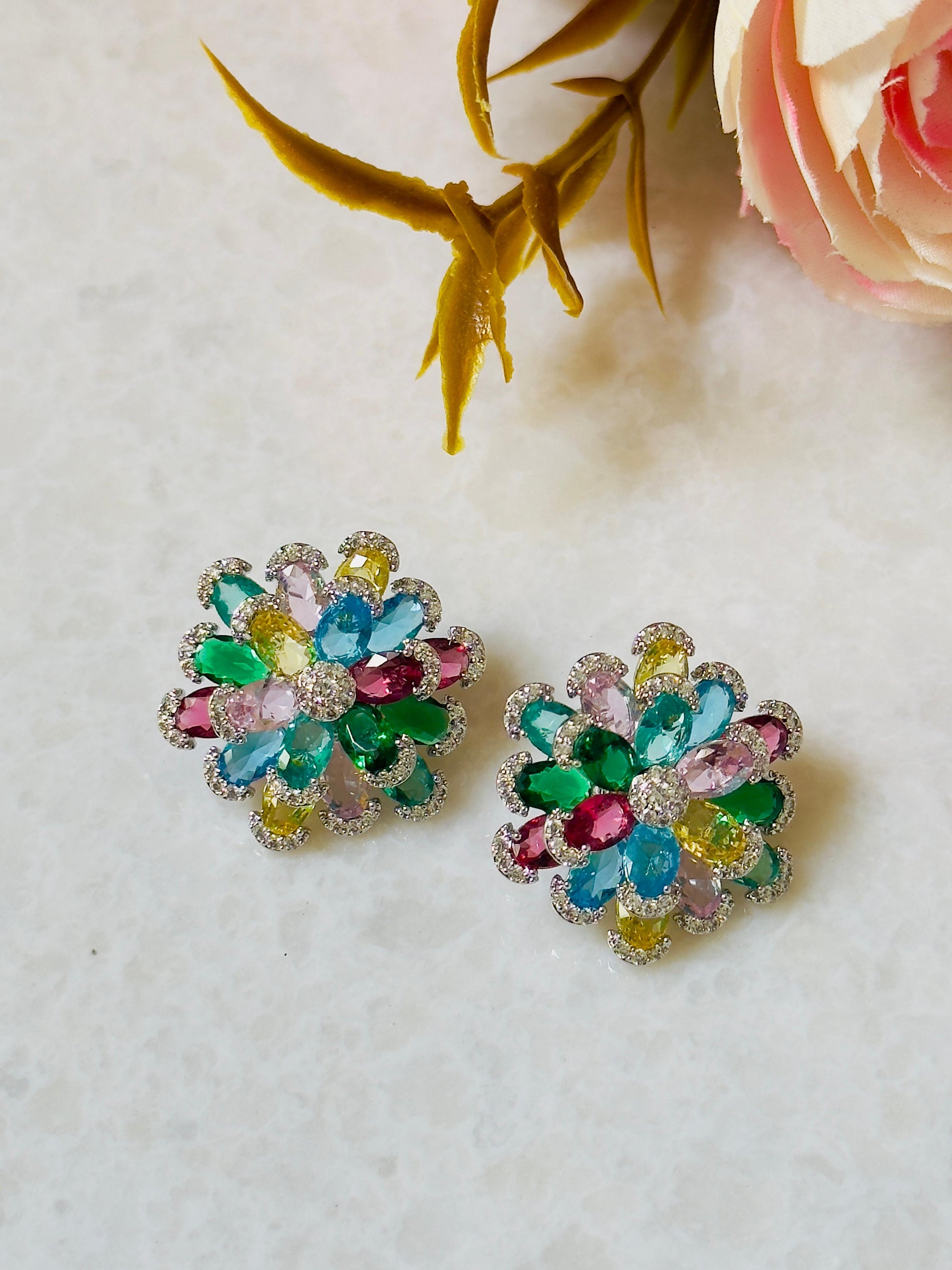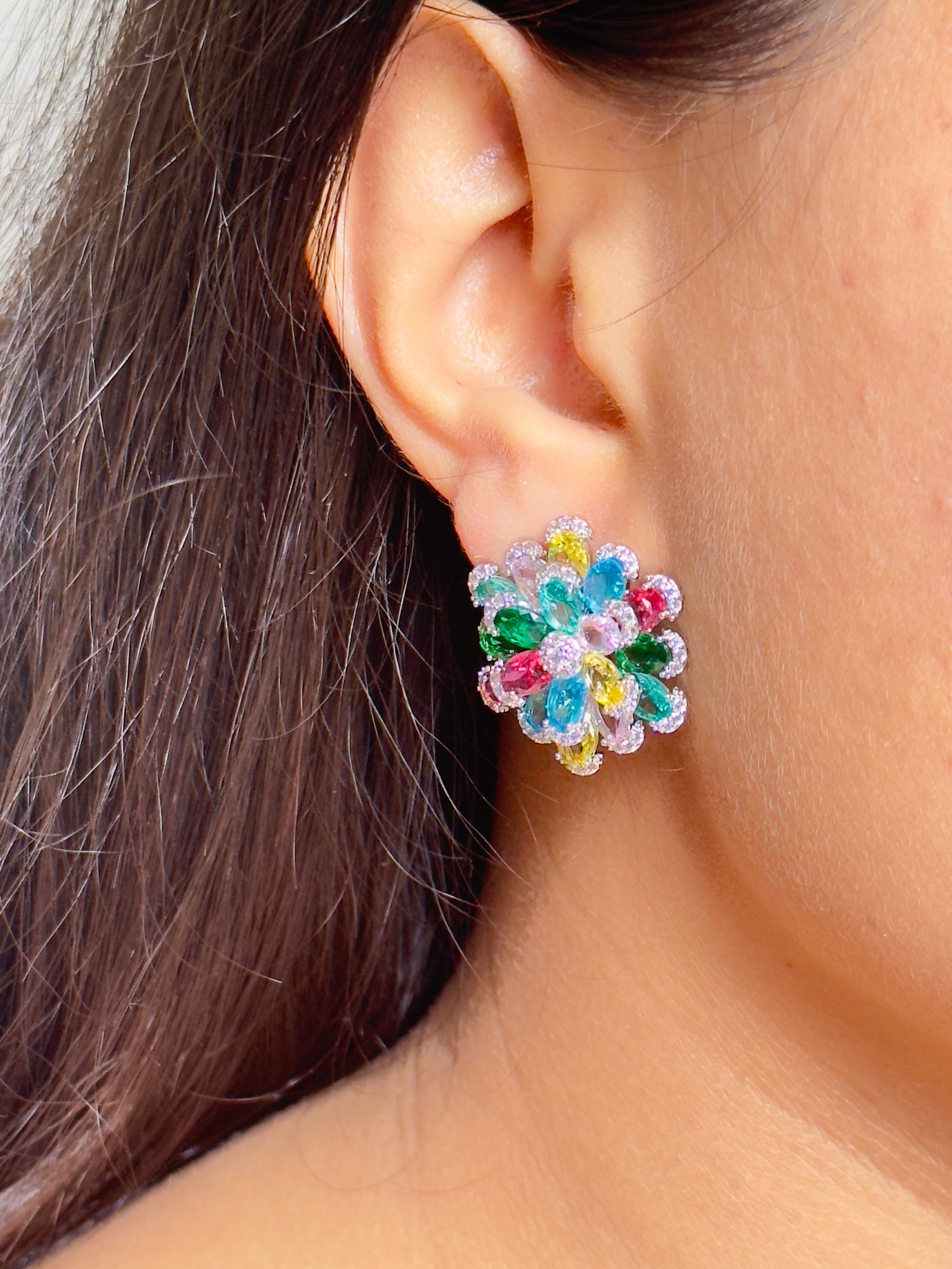 Vibrant Blooming Multicolor CZ Flower Earrings