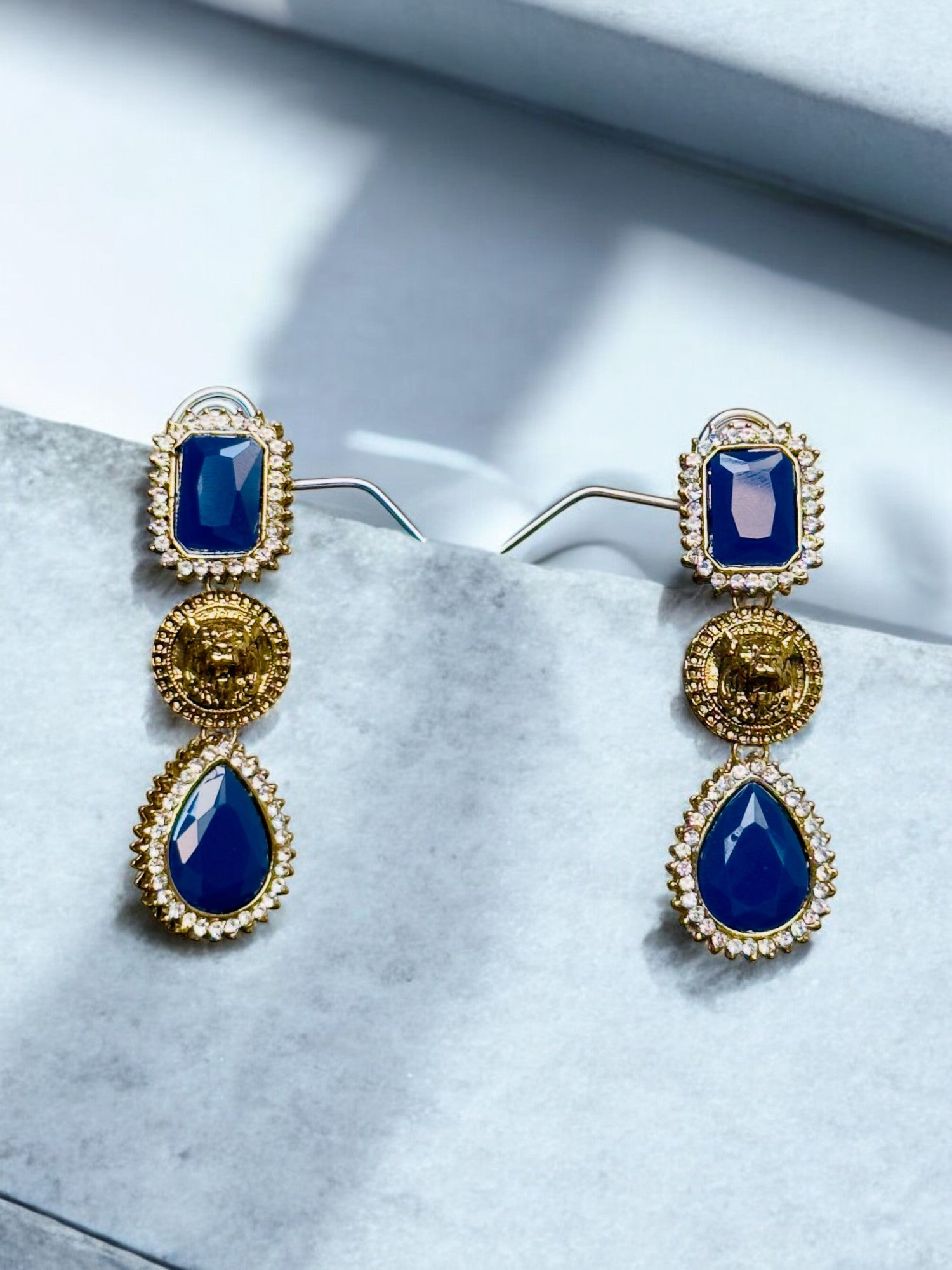Shop these out of the box sabyasachi styled danglers at best prices. It has 3 elements- rectangular colored stone, sabyasachi gold-plated lion, tear drop stone.