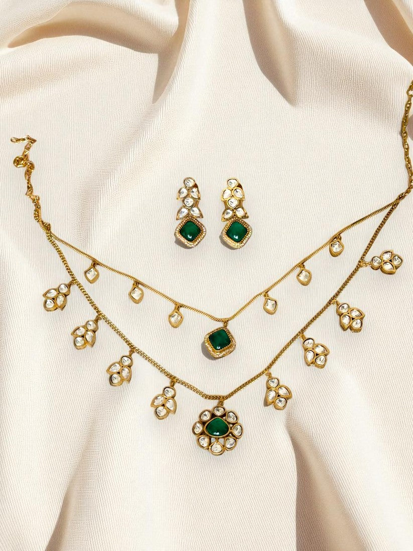 This Liyana layered necklace and matching earrings set is designed to bring a touch of luxury to your look. It features detailed Polki work and stunning emerald green stones. Crafted from high-quality brass and finished with 18K gold plating, it’s perfect for weddings, festive celebrations, or any special occasion. The balanced layering and intricate detailing make it a statement piece that beautifully enhances both traditional and modern outfits.