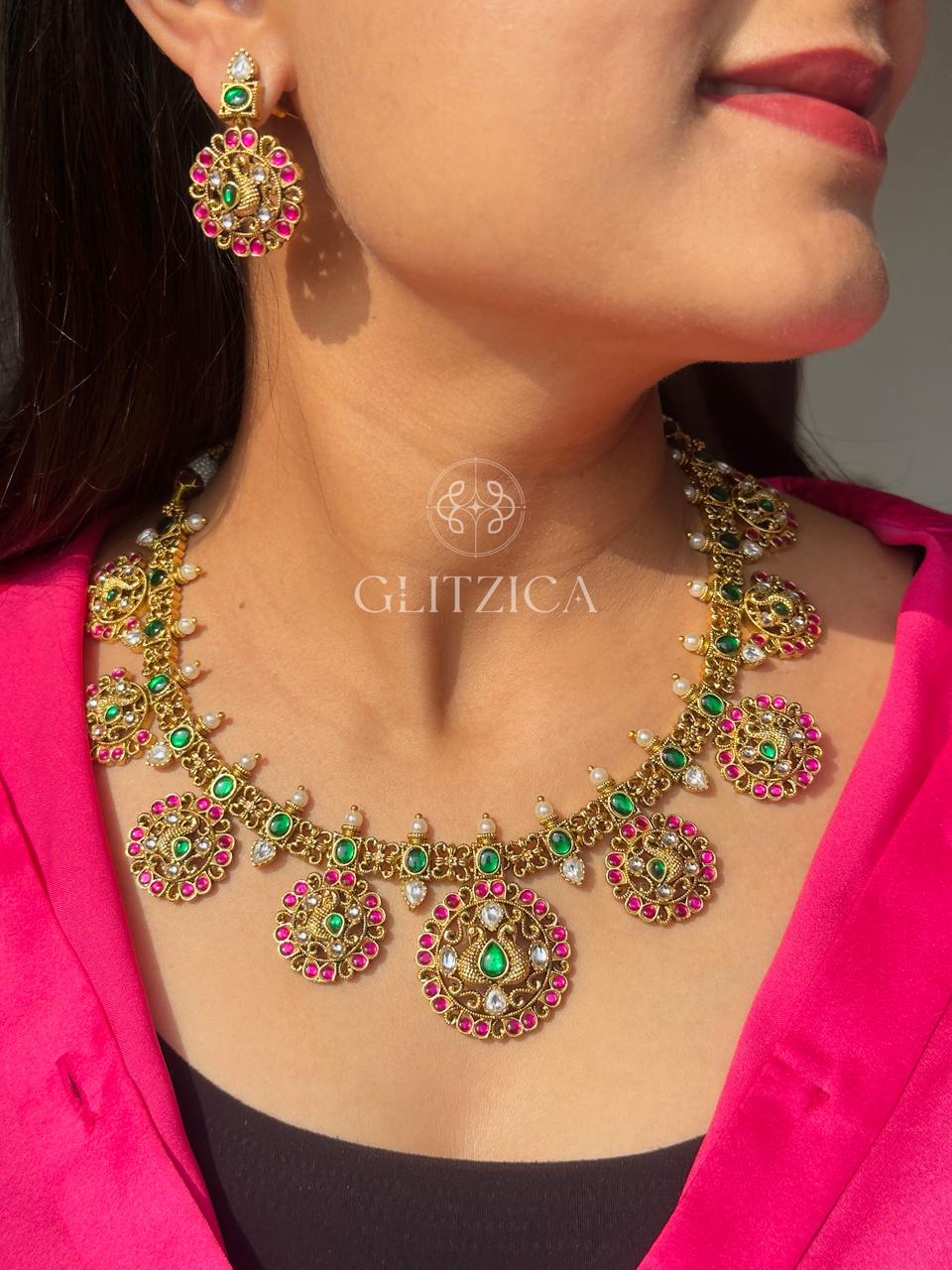 This exquisite Meenakshi Antique jewellery necklace set is beautifully designed in 18k gold-plated antique gold finish. Embellished with premium Jadau, Emerald, Pearl and Pachi Kundan stones, the set reflects rich heritage artistry inspired by traditional South Indian temple jewellery.