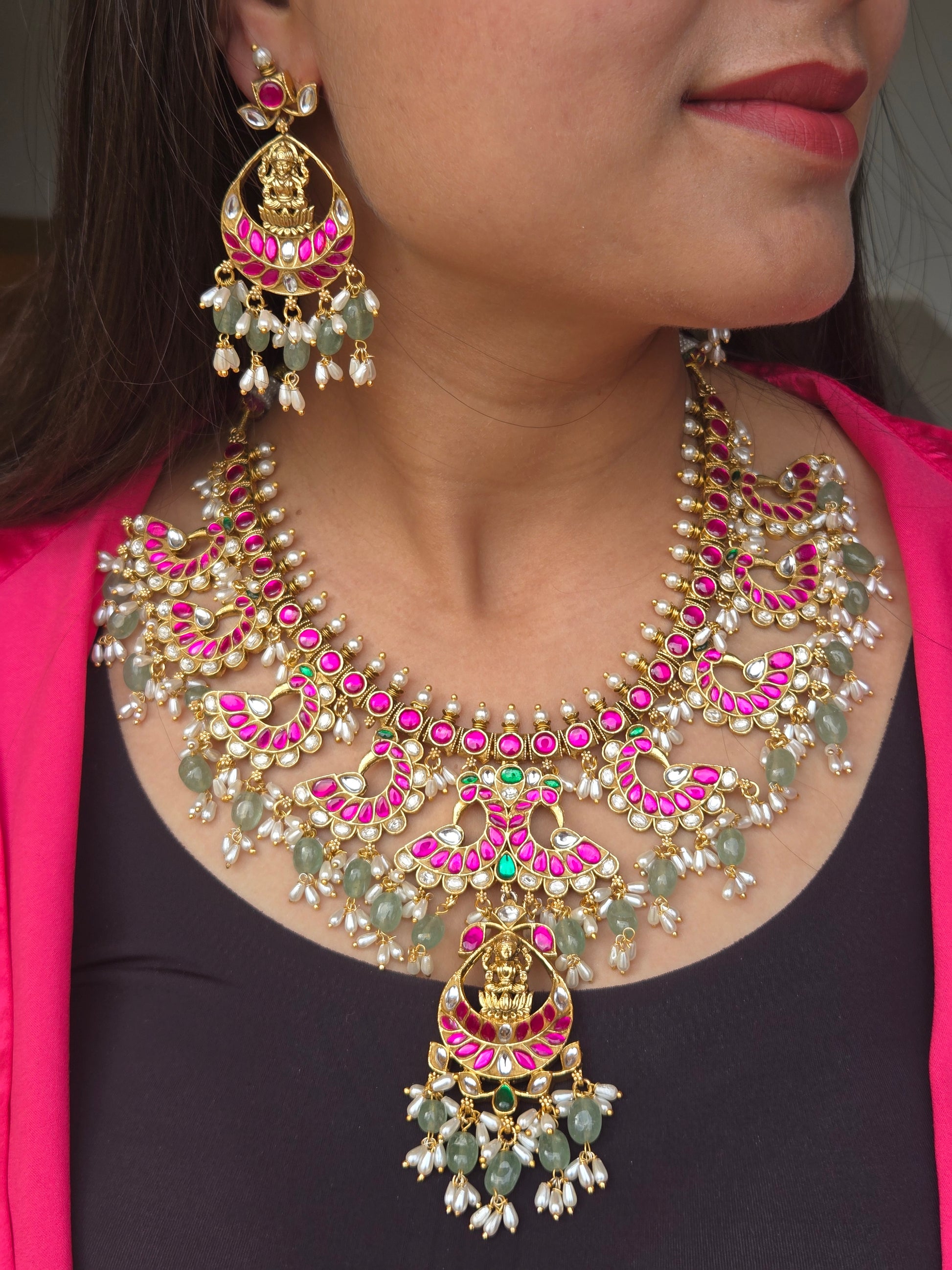 This Indumati Jadau 18K Gold-plated Guttapusalu Antique Necklace Set features classic rich pink jadau stones, soft aqua green beads, and layers of delicate pearls that move beautifully with every step.