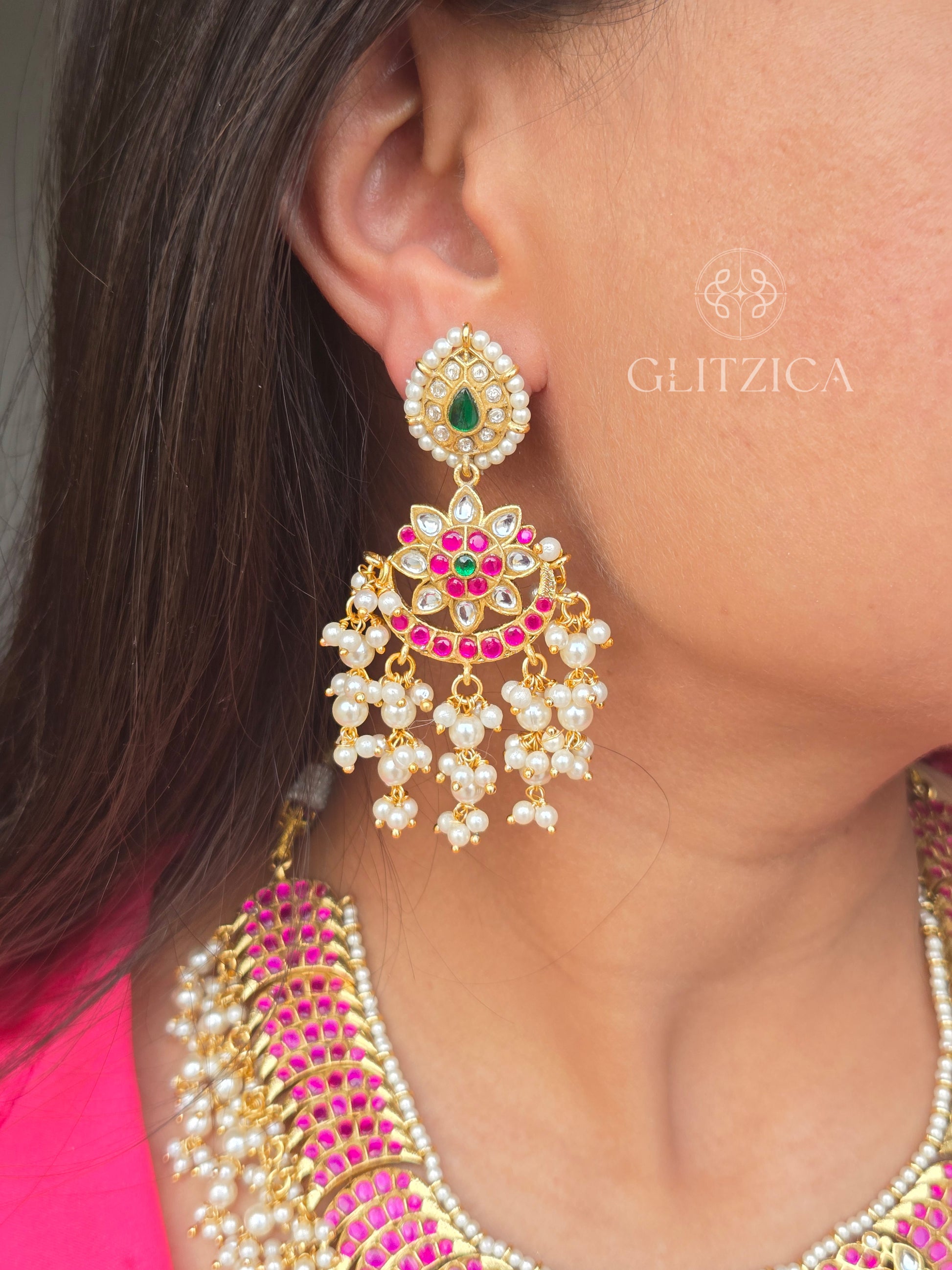 This Exquisite Draupadi Jadau Pendant Necklace Set is crafted with intricate Pachi Kundan and Jadau work. Designed in a rich 18k gold-plated antique finish and detailed with jadau-emerald stones and elegant pearl drops, this piece adds a royal touch to any look.